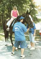 Nick holds Jesse while Amy adjusts stirrups at the American Legion in Plymouth.